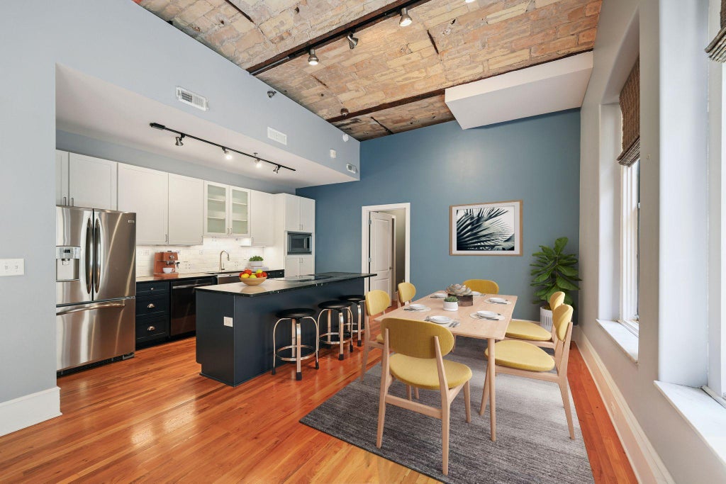 Find the Perfect blend of charm & comfort with classic & modern design elements in this Gorgeous 2BD/2BA loft located in the Great Northern Lofts - a registered historic landmark! With 53 unique and beautifully preserved units offering features such as 12’ brick barrel ceilings and classic 2 ¼” solid oak hard wood floors as found throughout the entirety of this unit! As you take your 1st steps into the unit, you will find a foyer leading into an open concept living room with large windows overlooking the private courtyard patio space below. (Just one of the many wonderful amenities the Great Northern has to offer!) The living room flows nicely into the spacious dining room & generously sized kitchen, which has received numerous updates including: New center island, custom lower cabinets, Soapstone Countertops, & SS appliances (w/ new dishwasher & Range). The 2 bedrooms are located on opposite sides of the unit, a layout which provides for ample privacy when guests are visiting. The Primary BD found to the "Right" of the LR features the same 12' brick barrel ceilings, newer matching oak hardwood floors, a walk-in closet w/ custom organization system as well as a new stackable washer/dryer which is beautifully tucked away behind a custom full height mirror/cabinet door. All of this flows seamlessly into the newly remodeled primary bathroom (2024 - taken down to the studs), featuring a stunning black/white themed finish w/Hex penny tile flooring, white subway tile, custom shower doors w/multiple Shower niches, custom white enameled cabinetry, and black soapstone countertops w/ lovely accented white veining. The 2nd BD found to the "Left" of the Kitchen/DR functions as a multi-purpose room due to the beautifully designed custom built-in Murphy bed w/ shelving that can be easily stored away, making way for an office, den, or game room. The 2nd bathroom has ALL of the same stunning features as the Primary and was also taken down to the studs in 2024 during its renovation/completion. Building amenities abound - 2 off-street parking spaces, party & exercise room, private courtyard patio, bike storage & add. storage locker. Near Farmers Market, CHS Field & plethora of Bars, Restaurants & parks! Additional notes: