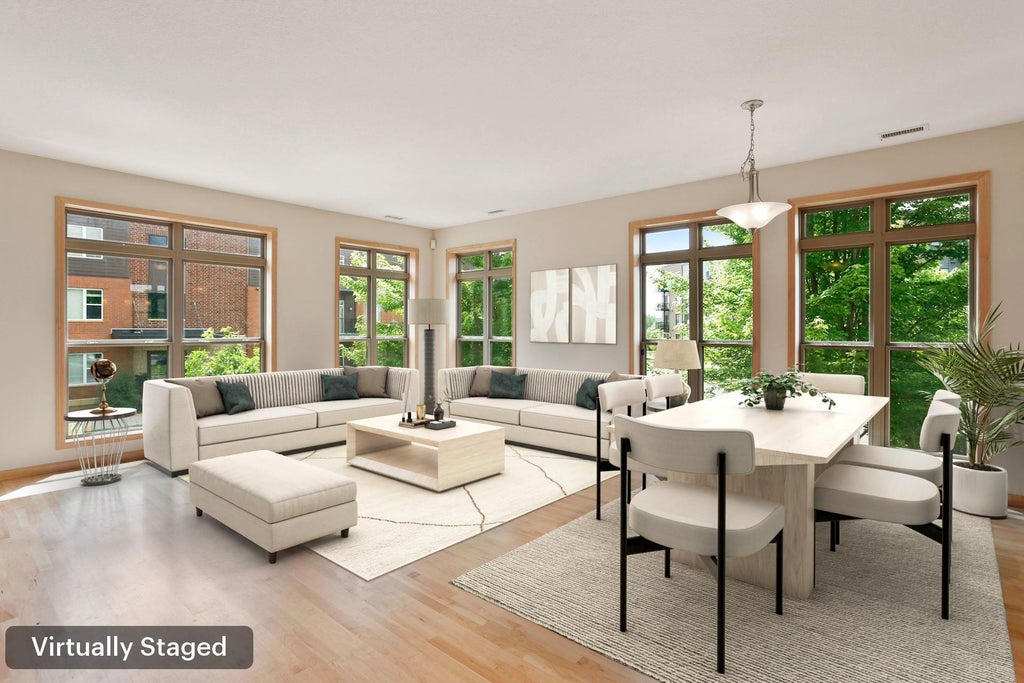 Spacious and sunny townhome with 3BRs, Den, and 3 garage stalls available just off West 7th Street. Live nestled between the Mac-Groveland and Highland neighborhoods of St. Paul, steps from the Mississippi National River & Recreational Area! Walking in the front door you'll find a bright main space with hardwood flooring, kitchen with stainless steel appliances and gas oven, large deck, bathroom with split vanities, and 2nd bedroom. Upstaris is a corner den / office and primary bedroom suite. Downstairs has another bedroom and the 3-stall garage. Included with rent: water/sewer/trash. Tenant responsible for gas, electricity, elective cable & internet. App Fee: $78; Admin Fee: $150. Photos of similar unit.