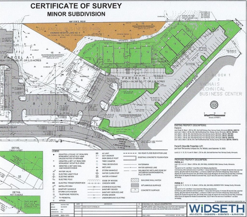 On this 2.28 acre site, Infrastructure already exists to possibly allow completion of a 22,500+ square foot Office Condo Complex, comprised of 3 individual buildings, an elevator lobby and a total of 7 condos and 7 PIDs. Poured concrete foundations (all walk-outs), city water/city sewer, natural gas/electric service, concrete curb/gutter, parking lot, storm sewer and retention pond. See Supplements for Colorized Survey of the 2.8 acre, Parcel B-1 and Utility Plan. There are 2 additional PIDs, for condo outlot and common ground that are not taxed. The foundations were structurally certified in 2022. The foundation square footage of each of the 3 buildings are 4386 sq.ft., 3032 sq.ft. and 3032 sq.ft., which does not include the elevator lobby to be shared by two of the buildings. The existing bituminous parking lot will require improvements as well as some repair in areas, prior to installing a second lift. Owner has Civil Engineering Drawings, Building plans and CIC documents - all available on request. The property is zoned Business Commercial, Light Industrial zoned properties are on the south side of the street. There are other possible options for this property - such as re-platting and rezoning for Industrial, or Garage Condominium Buildings. For this use, the City of Vadnais Heights approved a tentative plan in 2020, that would allow a total of 13 large, individual Garage Condos. Another option: designing and constructing something completely new, with utilities already in place. All dimensions and square footages are approximate.