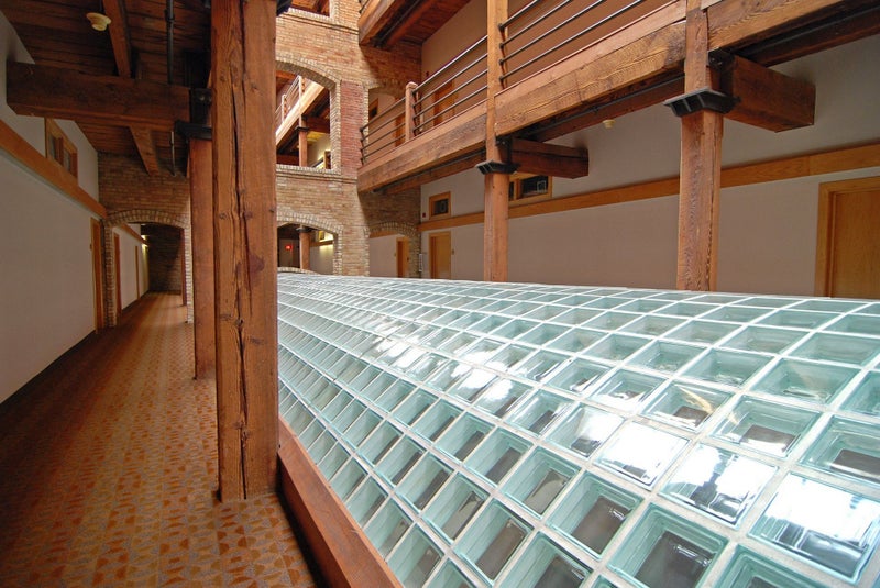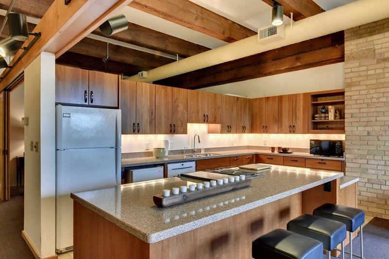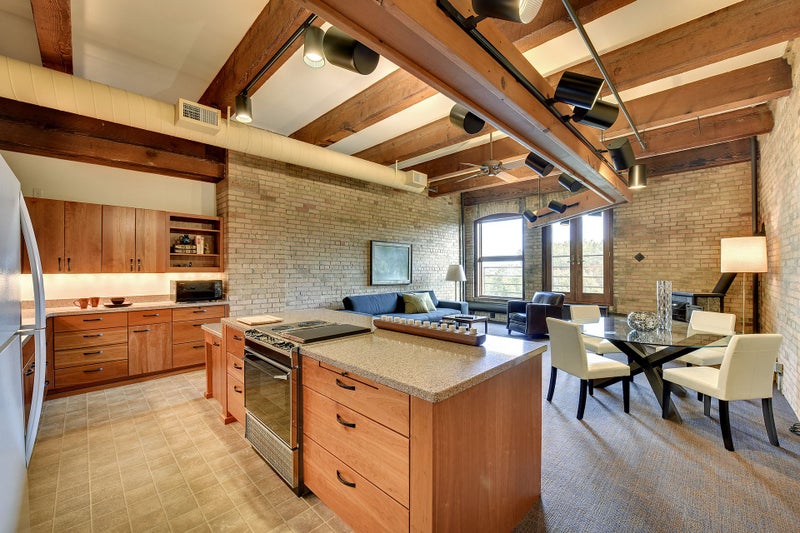Residences at Itasca Lofts embody the shapeshifting nature of modern loft living, including countless creative touches along the way. Here, you can find condos that run the gamut from very recently remodeled to those that haven’t changed much since the 80’s conversion. Regardless, there are often commonalities such as soaring wood ceilings, heavy timber beams, and glorious wood floors. Exposed brick walls contrast nicely with the wood surroundings, further accentuated by deep-set arched windows that invite the natural light inside. Handsome kitchens are completely open to the main living areas, with stone counters and wood cabinetry. Many of the units have rear-facing private balconies that look out toward the river.